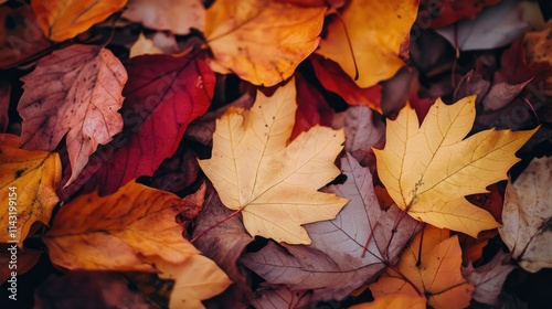 © Cyber Shutter, Obraz premium Vibrant Autumn Leaves in Varying Shades of Red Yellow and Brown on Forest Floor