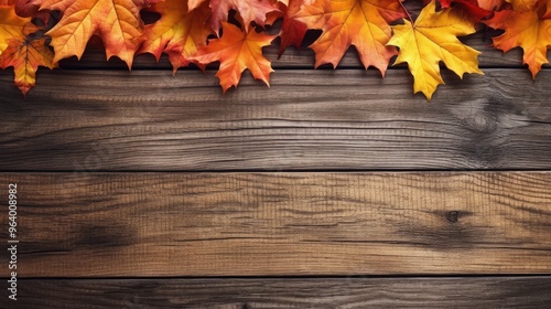 © evening_tao, Obraz premium Vibrant Autumn Leaves on Wooden Background