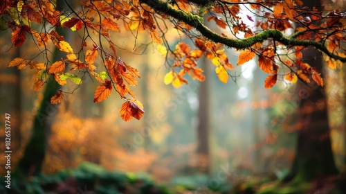 © Vlad, Fototapeta premium Vibrant autumn leaves over a soft, blurred forest backdrop