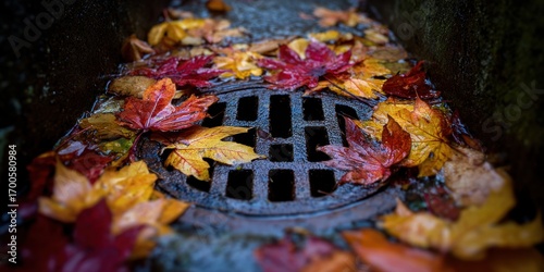 Fototapeta premium Vibrant autumn leaves surrounding a glistening metal drain in tranquil urban...