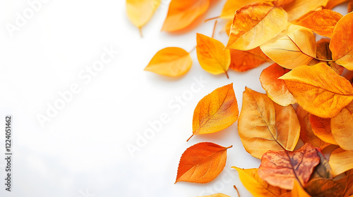 Fototapeta premium Vibrant autumn orange leaves scattered on a white background in seasonal...