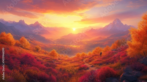 © Pannin, Fototapeta premium Vibrant autumn plateau with a single hiker making their way toward far-off, glowing mountains under a bright, warm sky. Nature at its most beautiful.