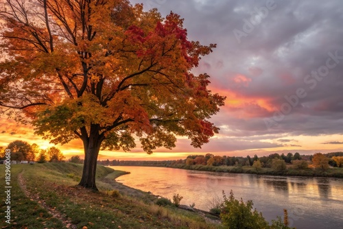 Fototapeta premium Vibrant Autumn Sunset by the River With Colorful Trees and Peaceful Scenery
