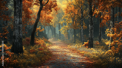 © liubimciki, Obraz premium Vibrant Autumn Trail Through Dense Woods with Sunlit Leaves in Rich Fall Hues Captured in High-Quality Photorealistic Style
