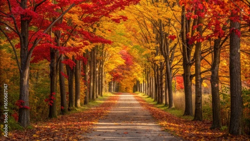 Naklejka premium Vibrant autumn tree lined path in golden sunlight