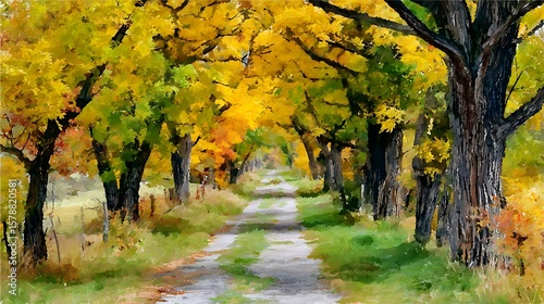 Naklejka premium Vibrant autumn tree tunnel path with golden yellow and green foliage