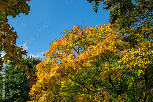 © iSky Media, Naklejka premium Vibrant Autumn Tree with Yellow Leaves Against Blue Sky