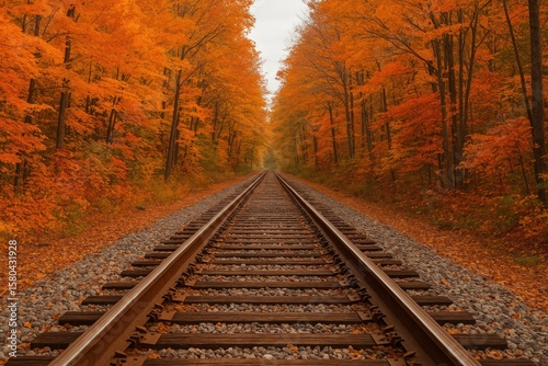 © TheWaterMeloonProjec, Fototapeta premium Vibrant autumnal forest encircling a railway line