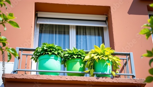 © CRISPIFLY, Naklejka premium Vibrant Balcony with Green Plants and Modern Apartment Facade
