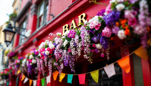 Fototapeta premium Vibrant bar facade adorned with colorful flowers and festive decorations in a lively street