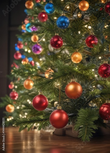 Fototapeta premium Vibrant baubles adorn a glowing Christmas tree, bokeh lights surround , decoration, merry