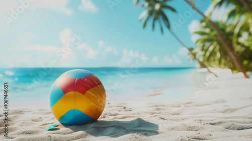 Obraz premium Vibrant beach ball on sandy shoreline with palm trees in tropical paradise