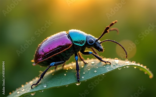 Naklejka premium Vibrant Beetle with Dewdrops in Morning Light