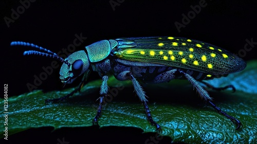 Fototapeta premium Vibrant Beetle with Glowing Spots on Leaf in Dark Environment