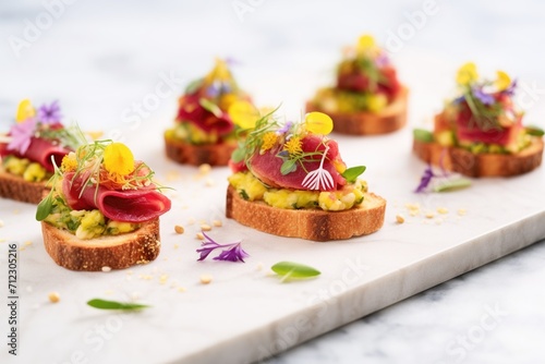Obraz premium vibrant beetroot hummus bruschettas on a marble surface