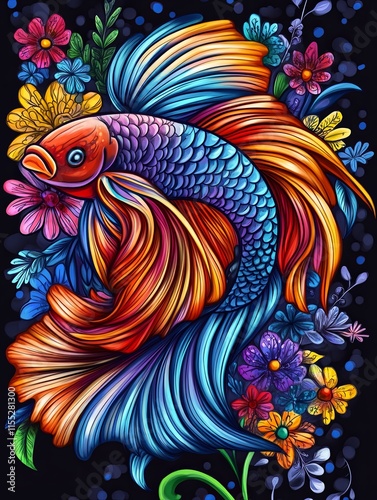 © Nuntapuk, Obraz premium Vibrant Betta Fish Swimming Among Colorful Flowers
