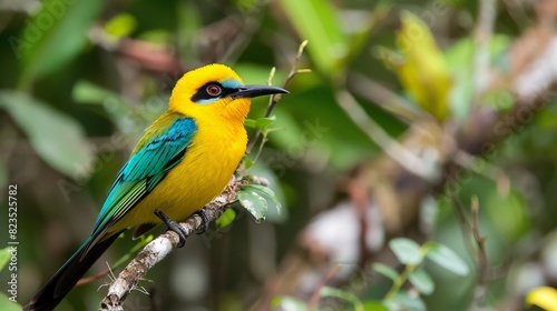 © Andrei, Obraz premium Vibrant bird on tree branch with colorful foliage against soft blurred background