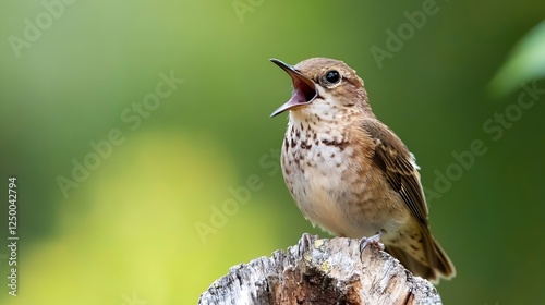 © Generative AI, Naklejka premium Vibrant Bird Singing on a Stump Surrounded by Lush Green Nature : Generative AI