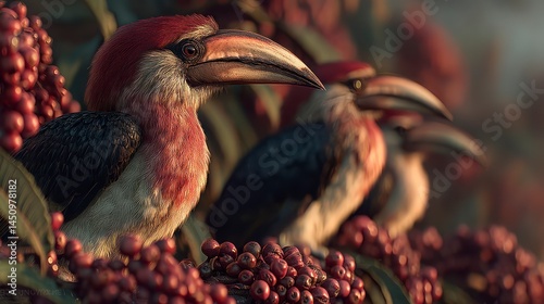 © Faha Studio, Naklejka premium Vibrant Birds Amidst Berries A Stunning Wildlife Scene with Detailed Feathers and Natures Pal