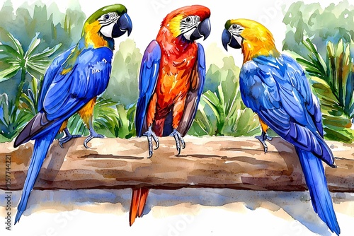 © possawat, Obraz premium Vibrant Birds in Tropical Rainforest Setting