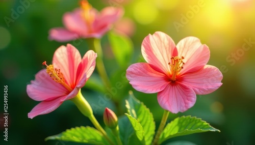 Fototapeta premium Vibrant blooming flowers, lush green leaves, soft sunlight , macro, vibrant