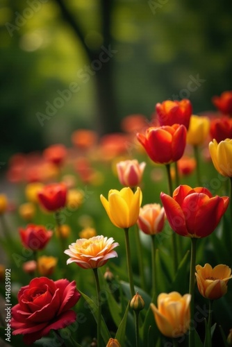 Fototapeta premium Vibrant blooms of tulips and roses amidst lush greenery, colorful, tulips