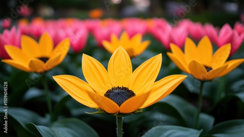 Naklejka premium Vibrant blossoms of yellow and pink create a stunning floral tapestry in...