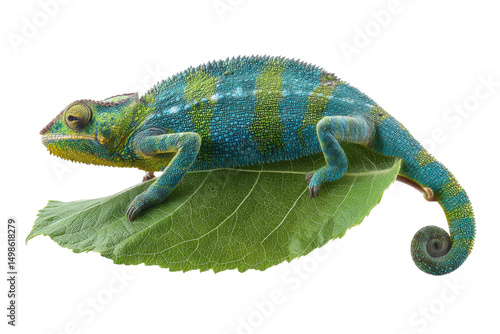 © Mr. Png, Obraz premium Vibrant blue and green chameleon on leaf against black background, cut out