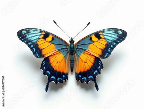 © Mikhail, Obraz premium Vibrant blue and orange butterfly displaying striking wings against a white background