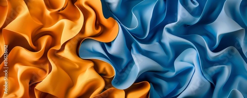 © Jullia, Fototapeta premium Vibrant Blue and Orange Silk Fabrics Undulating in Elegant Waves