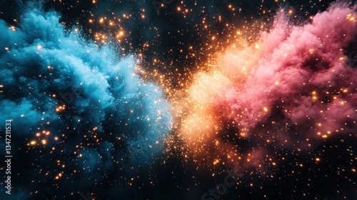 Fototapeta premium Vibrant blue and pink smoke clouds collide, sparks ignite amidst cosmic dust