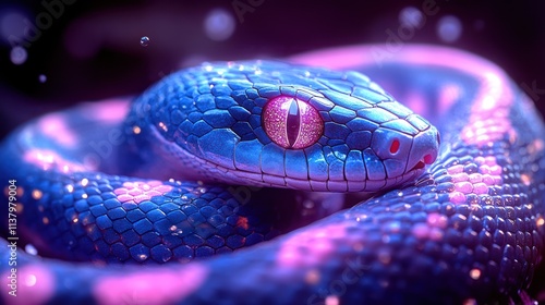 Fototapeta premium Vibrant blue and pink snake coiled, glowing scales, dark background.