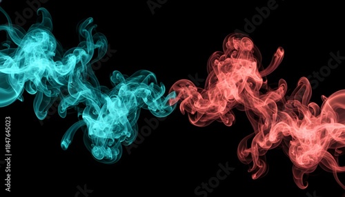 © Tama, Fototapeta premium Vibrant blue and red smoke tendrils swirl and dance against a dark background