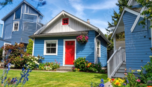 © Danis, Obraz premium Vibrant blue and white homes with colorful gardens