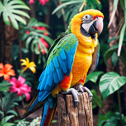 © 4CreativeWorld, Naklejka premium Vibrant blue and yellow macaw perched on a branch in a lush tropical setting.