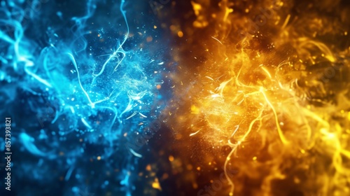 © AlfaSmart, Fototapeta premium Vibrant blue and yellow sparks against a dark background