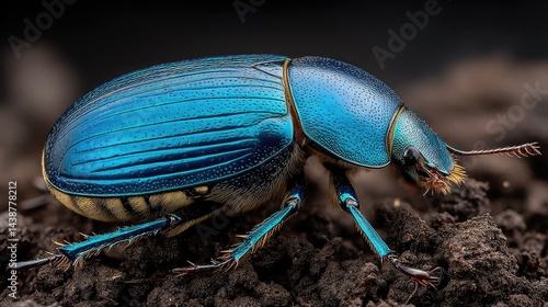 © Yuyun, Naklejka premium Vibrant blue beetle on dark soil