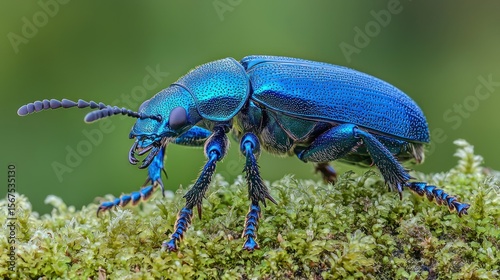 © KASANUN, Naklejka premium Vibrant blue beetle on moss