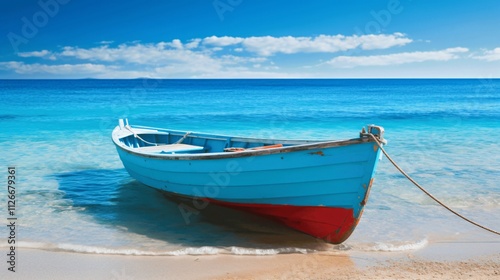 © S@photo, Naklejka premium Vibrant Blue Boat Resting on Serene Tropical Beach under Clear Sky