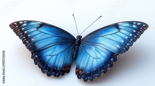 Fototapeta premium Vibrant Blue Butterfly in Mid-Flight Displaying Delicate Details Against a Bright White Background