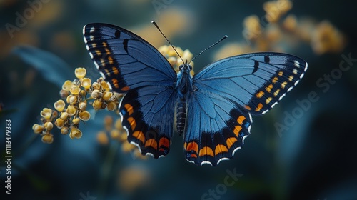 © Milaballe, Fototapeta premium Vibrant blue butterfly on yellow flowers in natural setting