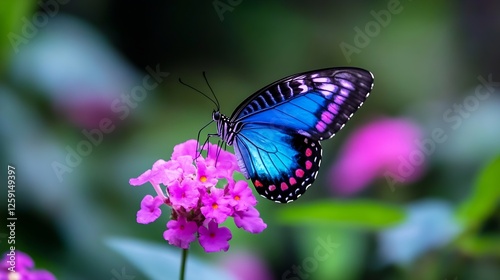 Naklejka premium Vibrant Blue Butterfly Perched on a Pink Flower Creating a Stunning Contrast...