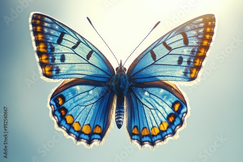© vefimov, Fototapeta premium Vibrant blue butterfly wing against sky background, close up.
