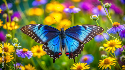 Naklejka premium vibrant blue butterfly with delicate iridescent wings rests among colorful flowers, creating stunning contrast in lively garden setting. scene evokes sense of tranquility and beauty