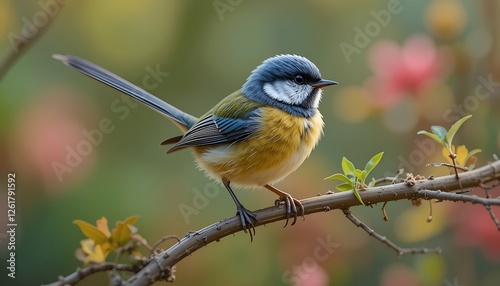 Fototapeta premium Vibrant Blue-Capped Yellow Bird Perched on a Branch in a Colorful Garden Setting