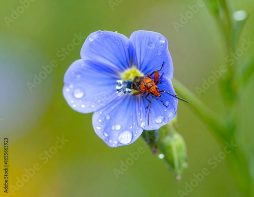 © Ambar, Fototapeta premium Vibrant blue flower with a small red insect