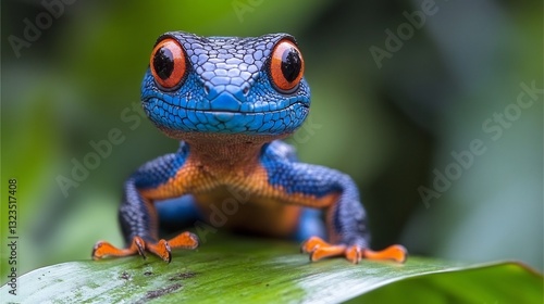 © heinng, Obraz premium Vibrant blue gecko playfully poses leaf bright light. AI Generated