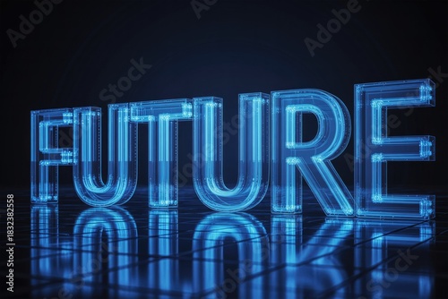 Obraz premium Vibrant blue, glowing holographic 'FUTURE' text stands on a dark digital grid. Symbolizes technological advancement, innovation, and forward-thinking vision.