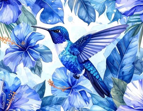 © jodi, Fototapeta premium Vibrant blue hummingbird amidst tropical flowers (1)