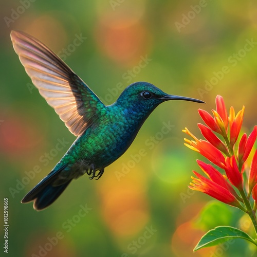 © Acrdesign, Obraz premium Vibrant blue hummingbird hovering near red tropical flower